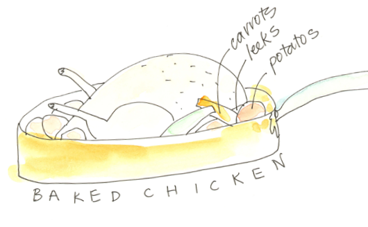 If you want something a little more interesting, here are some other suggestions: Stuff some herbs into the chicken cavity. Or you can add some garlic, lemon slices, quartered onion chunks, half an orange…just almost anything tasty can be put into the cavity to create flavor. You can also surround your chicken with 1” carrot chunks, 1” long leek slices, and small potatoes.