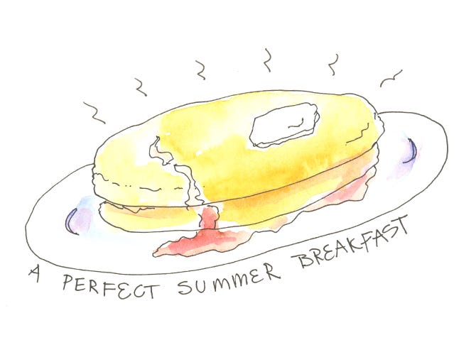 I’ve made these the past two years when visiting a friend’s Michigan summer home when there is abundant fresh sweet corn. It’s become a bit of a tradition for us. We start with fresh sweet corn from a roadside stand or farmers market and cut it off the cob the night before. With some thick crisp bacon, these light fluffy pancakes are one of the greatest treats I know. This makes enough for 4 servings, so I usually double this recipe.