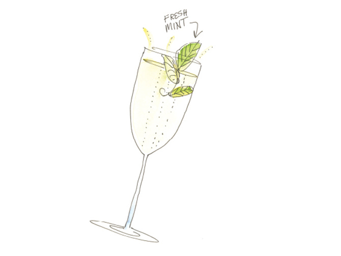 Pour equal parts green tea and Pelligrino water over ice or into a champagne flute. Squeeze a quarter of a lemon into the drink and add a large sprig of fresh mint.