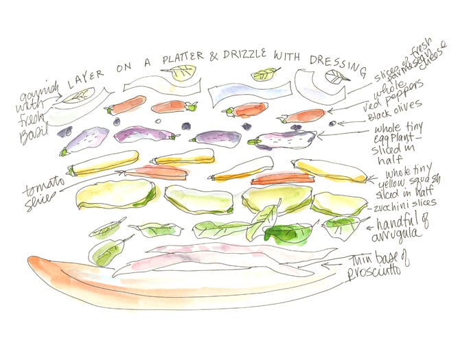 Artfully assemble the dish on a large platter, beginning with a bottom layer of arugula. Then begin layering the veggies. I usually start with the eggplant, then add peppers, zucchini and yellow squash. Between the layers sprinkle basil leaves, a little dressing, and some salt and pepper. If you like anchovies, add small bits into the layering process. Save the tomatoes for the top layer. Tear small bits of the buffalo mozzarella over the tomatoes. Add more basil. Sprinkle with more dressing and capers. Then put the parmesan slices on top. Sprinkle with olives and more basil.