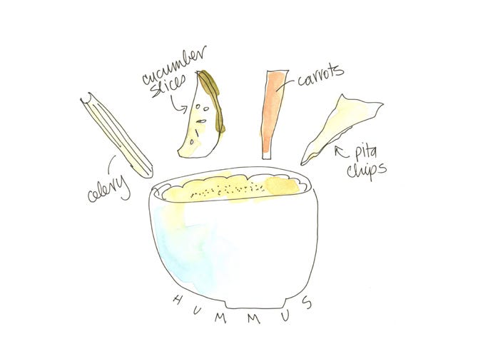 Hummus is nutritious and comforting. It’s a hit with kids and holds its own at a cocktail party. Experiment with additions to the hummus such as: roasted peppers, anchovies, basil, mint, or parsley. These can be chopped and added to the top or incorporated into the dip.
