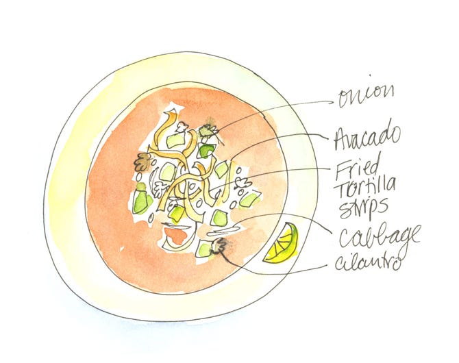 Serve in shallow bowls. Squeeze a wedge of lime over each bowl just before serving. Then add accompaniments to taste: fried tortilla strips, chunks of fresh avocado, shredded cabbage, chopped white onion, dried hot red pepper flakes, a wedge of lime and cilantro leaves.