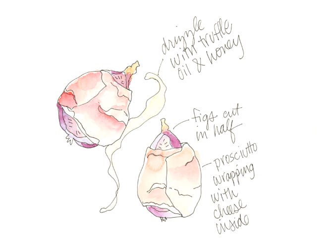 Put a small piece of cheese (the equivalent of 1/2 teaspoon chunk) against the cut part of each fig half. Wrap each fig half and cheese chunk with a strip of the prosciutto.
