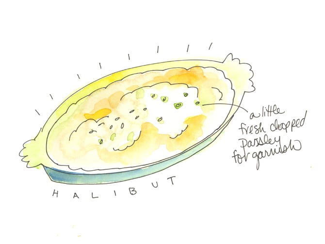 This is a complete meal with the layers of artichokes, potatoes and halibut all melding together to create a sum greater than the parts. I bake these in individual dishes for dinner parties. It’s beautiful to have this complete entree contained in a single container. You could also bake it all together in a single dish if you prefer, then serve it onto plates. Serves 4.