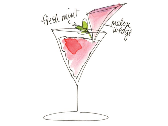 Serve in chilled glasses garnished with watermelon spears and topped with fresh mint sprigs.